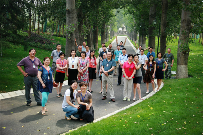 大家在獨(dú)特的采用特殊工藝的美心磚鋪砌的停車場上合影留念