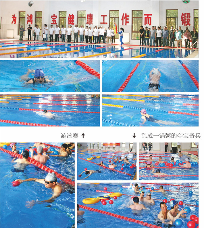 熱身賽后,全體人員集合后,列隊(duì)行進(jìn)到比賽場地桂苑泳館,準(zhǔn)備進(jìn)行下午的比賽。下午的比賽項(xiàng)目為300米個(gè)人游泳、4X60米游泳接力賽及水上趣味賽奪寶奇兵。參賽運(yùn)動員換上比賽泳裝后各就各位,隨著哨聲想起,比賽正式開始。無論是個(gè)人比賽還是團(tuán)體比賽,各參賽隊(duì)員懷著“會當(dāng)擊水三千里”的豪情,各個(gè)精神飽滿,奮力拼搏,只見大家你追我趕,互不相讓,自由泳劈波斬浪,蛙泳優(yōu)美矯健,泳池里浪花翻騰、人影起伏,引來現(xiàn)場喝彩聲一片,氣氛相當(dāng)活躍。各團(tuán)隊(duì)選手團(tuán)結(jié)協(xié)作,互相配合,拉拉隊(duì)員們加油鼓勁助威聲給選手們增添了動力與激情,游泳館內(nèi)頓時(shí)熱鬧非凡,激烈的比賽真正體現(xiàn)了力量與速度的比拼,幾輪比賽下來,團(tuán)隊(duì)的比分逐漸拉開。