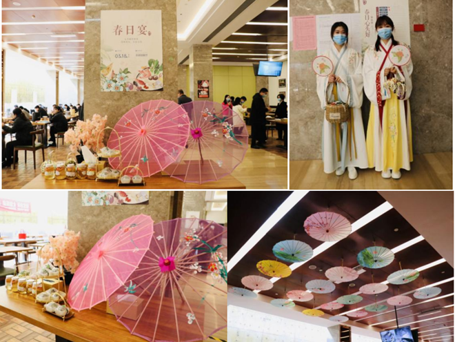 一抬頭,便能望見(jiàn)一排排撐開(kāi)的花紙傘,伴隨著《煙雨江南》的詩(shī)意歌聲,讓人如同迎著春風(fēng),徜徉在江南雨巷之中。就餐人員在有序打餐之后,更是按捺不住心中喜悅,紛紛拍照打卡,記錄此刻美好。