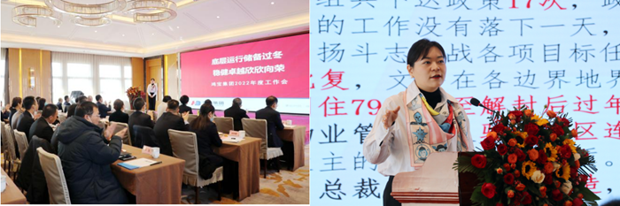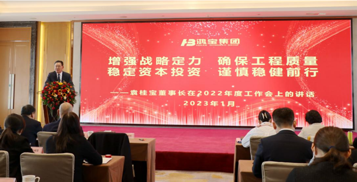在認真聽取各位高管領導的總結發言后,集團總裁袁曉曦以《底層運行儲備過冬 穩健卓越欣欣向榮》為題發表鴻寶集團2022年度工作報告。曉曦總指出,2022年國際形勢風高浪急,國內環境艱巨繁重,但大戰大考煉真金,鴻寶集團在二十四字戰略方針指導下逆勢奮進,堅持底層運行,樹立底線思維,錨定發展目標,東壩頭大橋全面開工,銀團融資逆勢突圍,海南總部竣工交付,物業抗疫三年堅定口碑,取得了卓越成績,也迎來了經濟向好、欣欣向榮的春天。